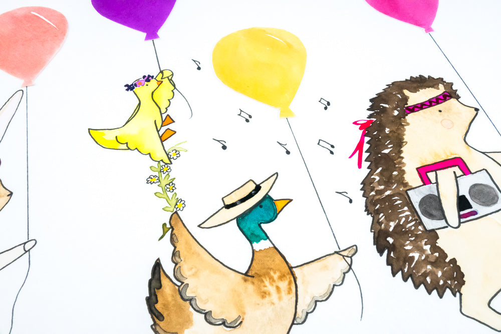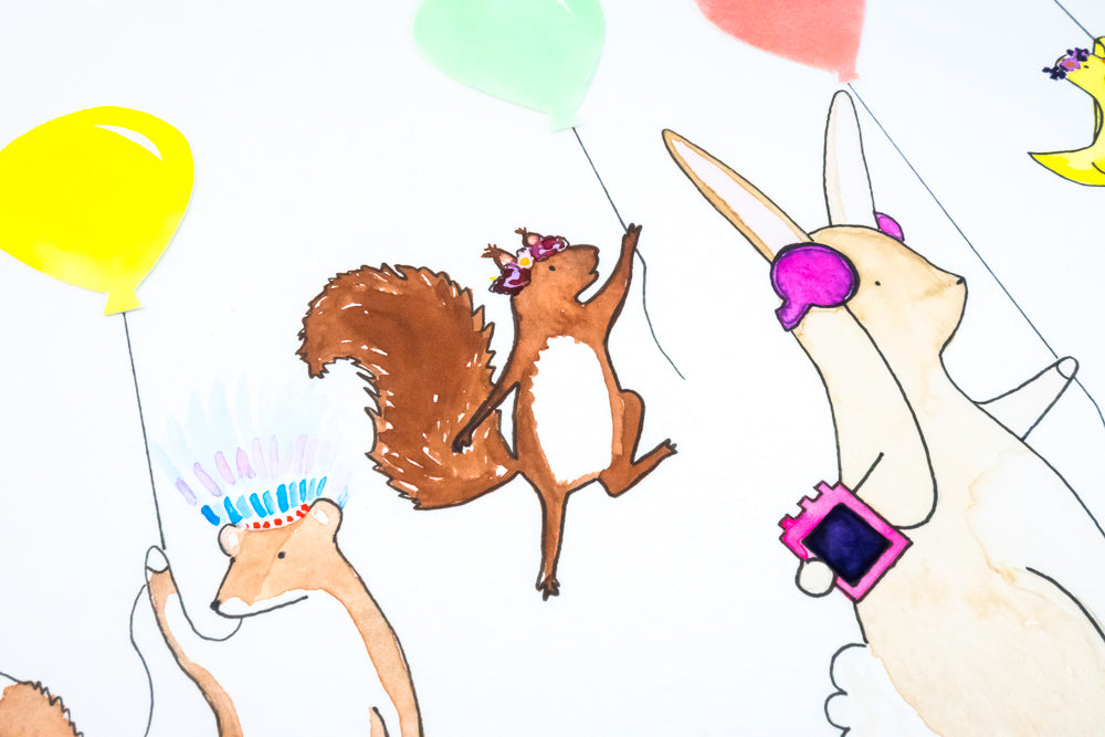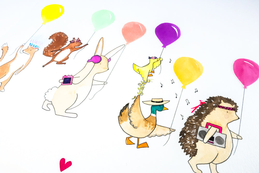 unique hand drawn illustration created in ink and watercolour, with collaged balloon appliqué, signed & stamped by the artist.
