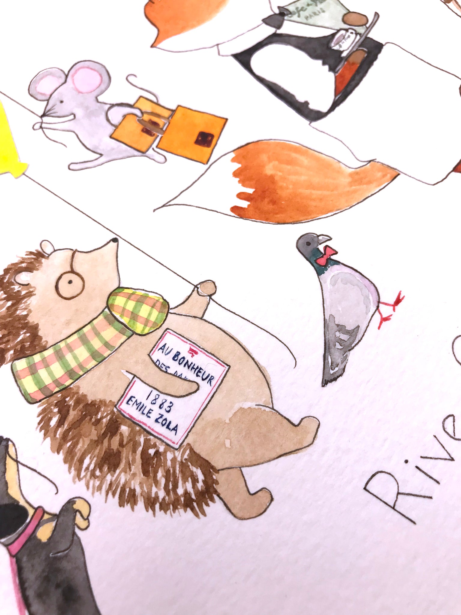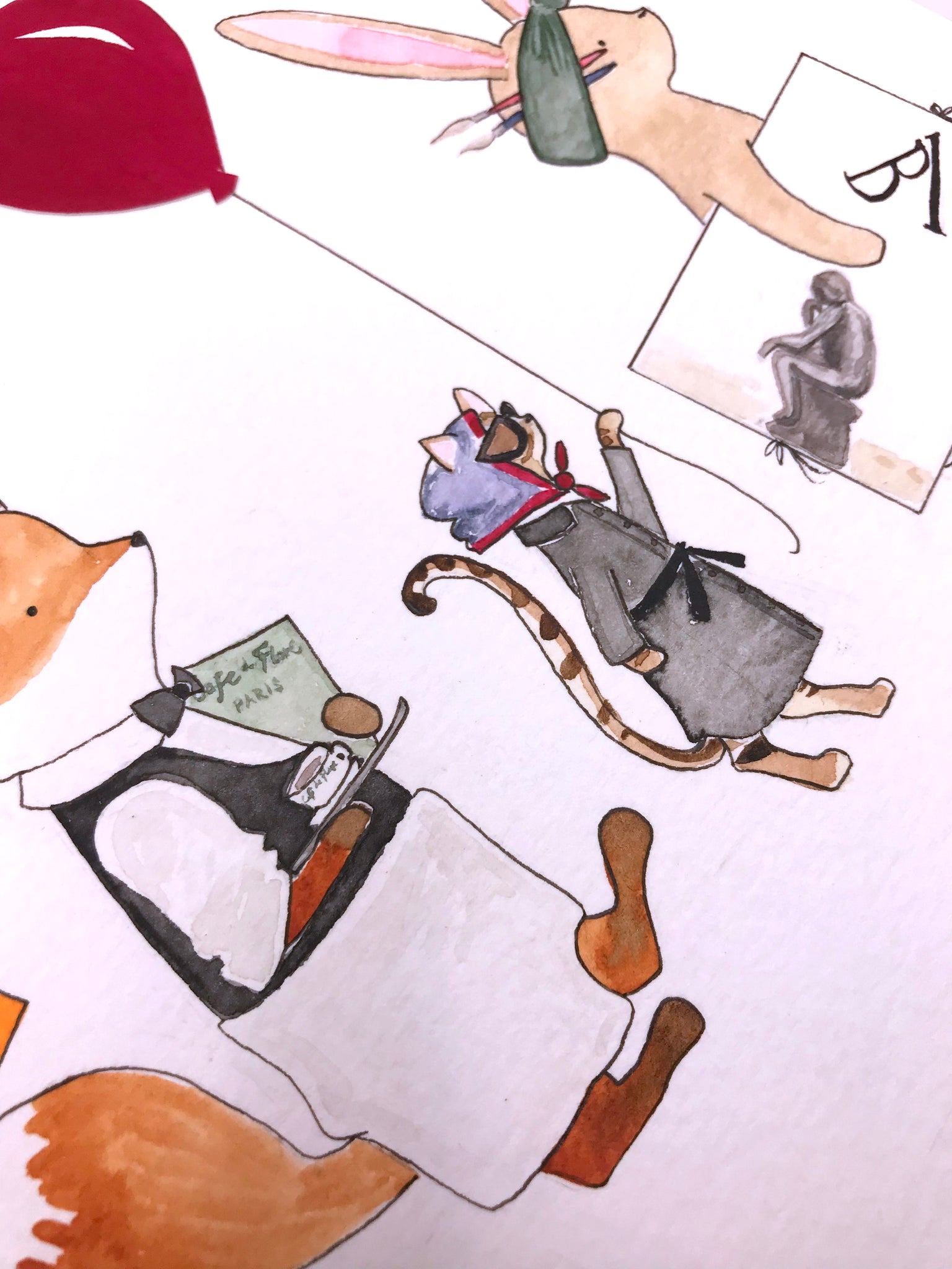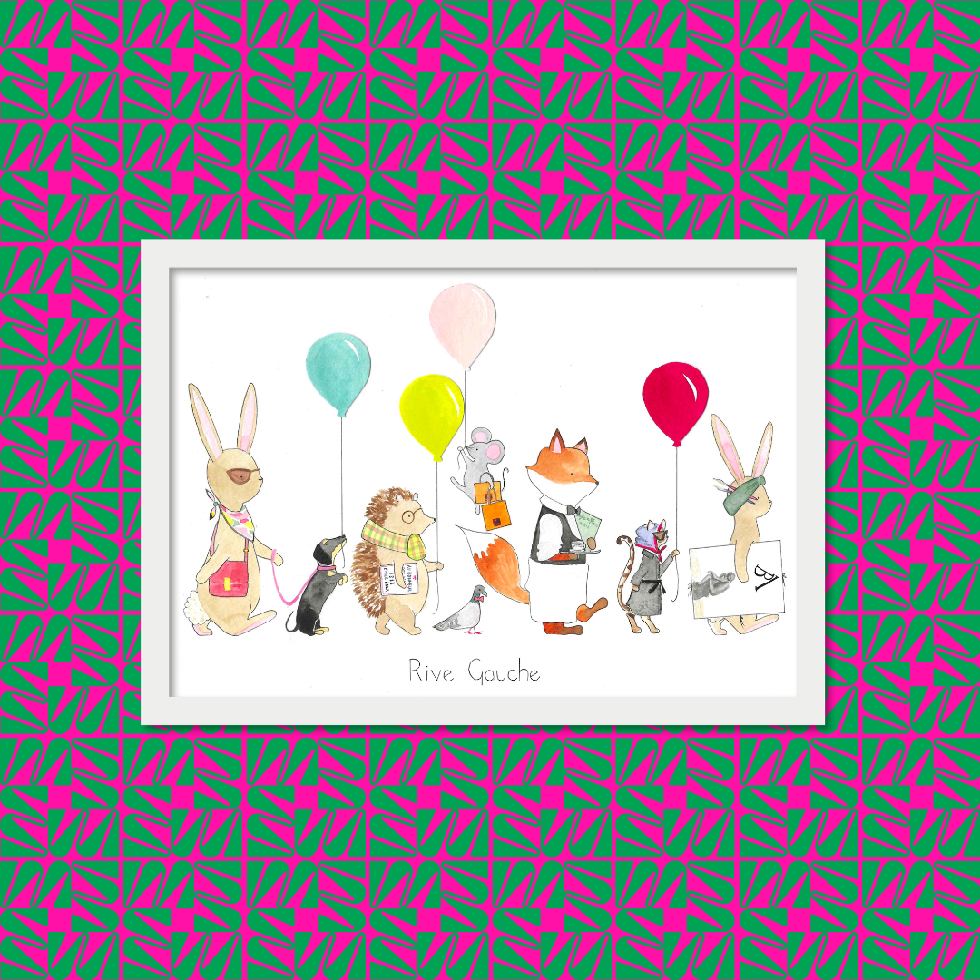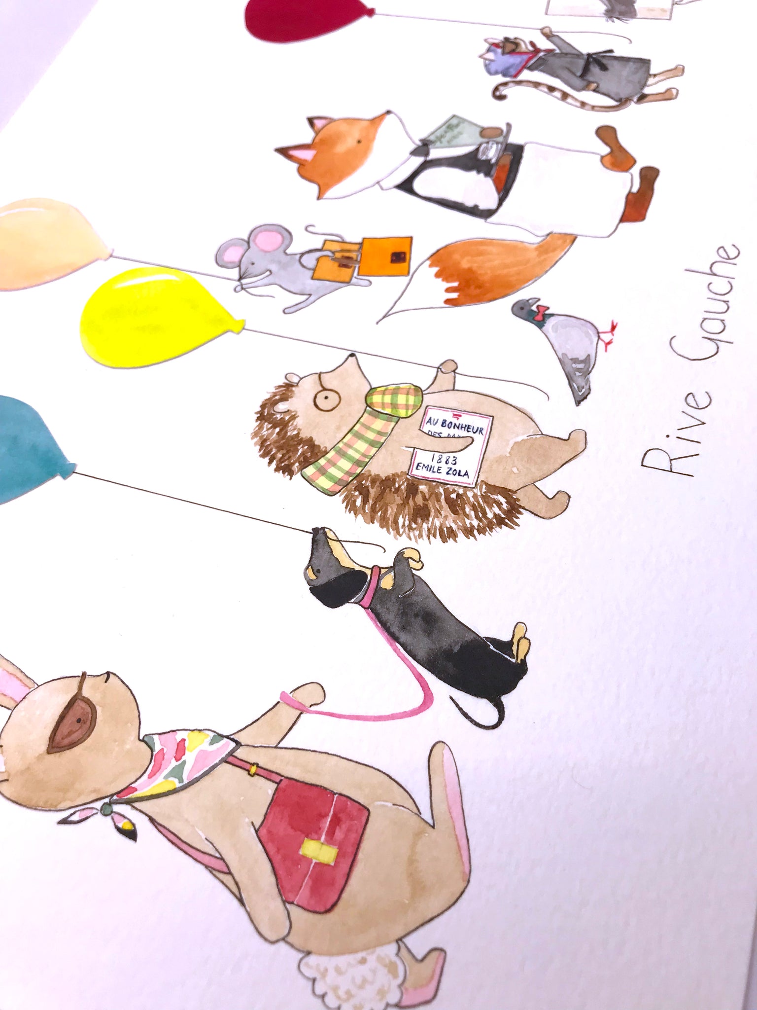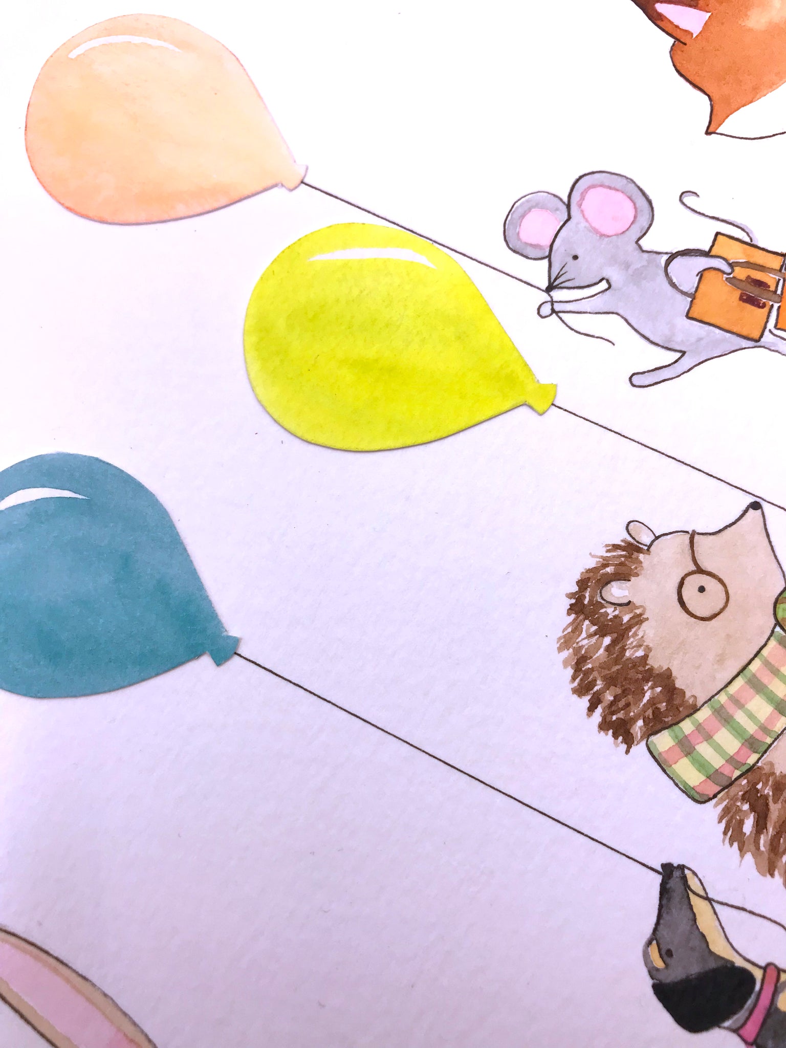 unique hand drawn illustration created in ink and watercolour, with collaged balloon appliqué, signed & stamped by the artist.